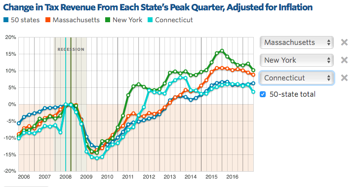 Both New York and Massachusetts have fully bounced back from the recession in terms of job growth and tax revenue. Massachusetts has recovered over 300 percent of the jobs lost during the 2008 recession has now seen 8.9 percent revenue growth, while New York revenue has increased 10.2 percent.