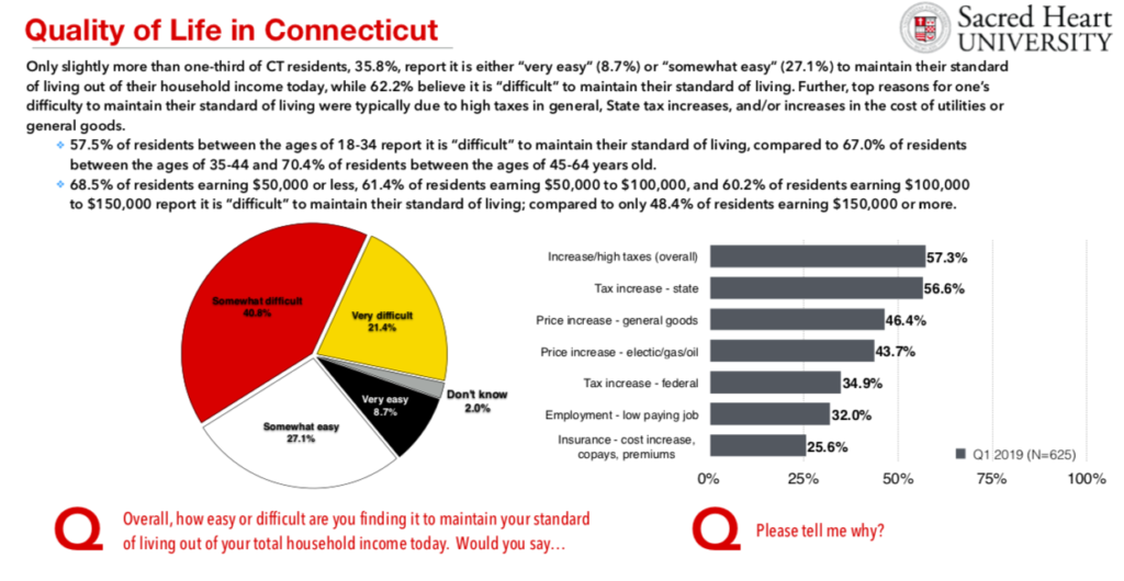Sixty-one percent of respondents who earned between $50,000 and $150,000 per year reported it was “difficult” to maintain their standard of living in Connecticut and blamed high taxes and price increases.