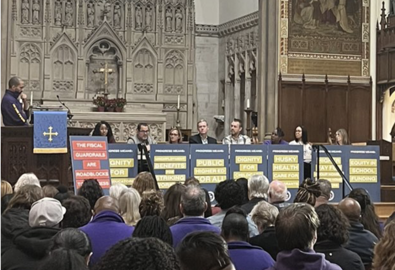 Connecticut For All, a coalition of unions and special interest groups, hosted a town hall discussion on Tuesday (Dec. 3), at Christ Church Cathedral in Hartford, demanding legislative action to overhaul the state’s fiscal guardrails and clear the way for billions in new spending.