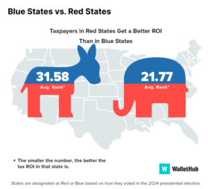 Political affiliation appears to play a role too. Red states dominate the top ROI rankings, while blue states are stacked at the bottom. Of the ten worst-performing states, seven are blue — including New York (44th), California (47th), Hawaii (49th), and New Mexico (50th). On average, blue states rank 31.58 in taxpayer ROI, while red states average 21.77.