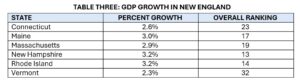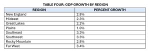 New England, as a whole, was middle-of-the-pack when compared to other U.S. regions, with a 2.8% GDP growth. The Far West — which includes Alaska, California, Hawaii, Nevada, Oregon, and Washington — finished with the highest at 3.4%. (See Table Four)