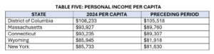 Compared to other economic indicators, Connecticut per capita personal income was one of the highest in the country, finishing 3rd overall when including the District of Columbia. (See Table Five) Yet its growth rate is a different story. In 2024, Connecticut’s personal income grew by 5.3%, which was 23rd best in the country, according to CBIA. This fell below the national average of 5.4%; meanwhile, North Carolina ended the year with the highest at 6.9%, and North Dakota, the lowest at 0.1%.