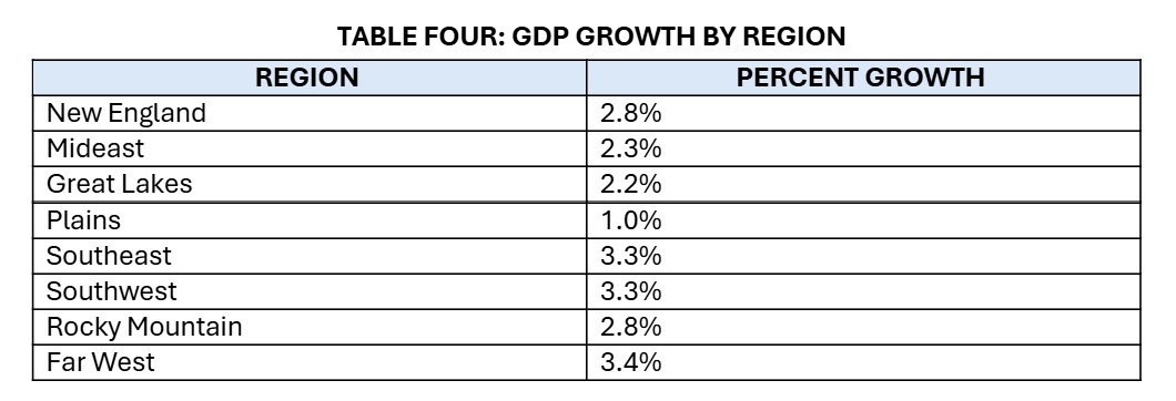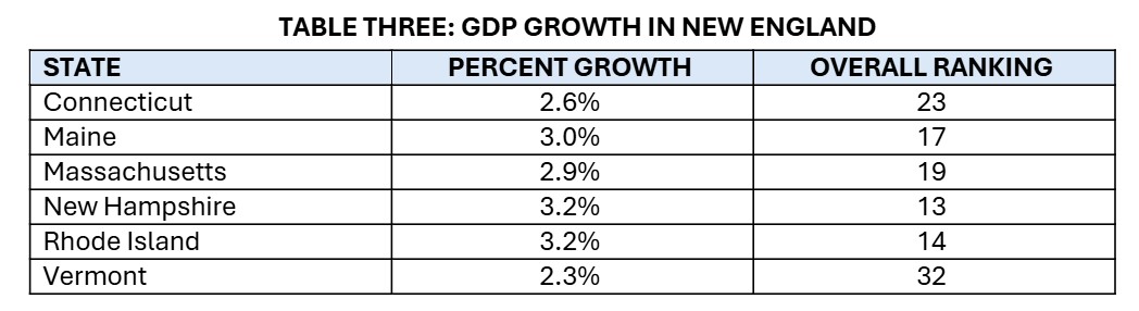New England, as a whole, was middle-of-the-pack when compared to other U.S. regions, with a 2.8% GDP growth. The Far West — which includes Alaska, California, Hawaii, Nevada, Oregon, and Washington — finished with the highest at 3.4%. (See Table Four)