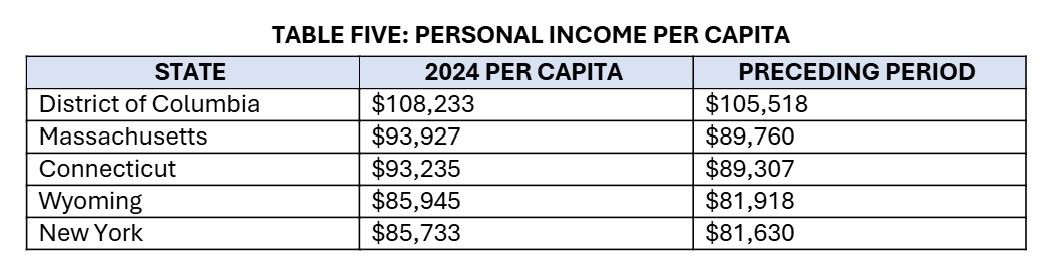 Compared to other economic indicators, Connecticut per capita personal income was one of the highest in the country, finishing 3rd overall when including the District of Columbia. (See Table Five) Yet its growth rate is a different story. In 2024, Connecticut’s personal income grew by 5.3%, which was 23rd best in the country, according to CBIA. This fell below the national average of 5.4%; meanwhile, North Carolina ended the year with the highest at 6.9%, and North Dakota, the lowest at 0.1%.