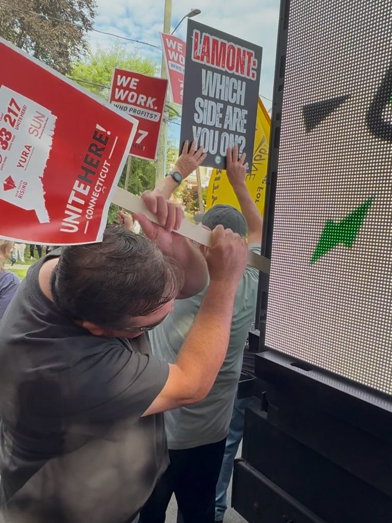 Legislators present at the protest included Reps. Nick Gauthier (D-Waterford), Steve Winter (D-New Haven), and Tom Delnicki (R-South Windsor). Rep. Gauthier posted proudly from the event with Rep. Winter, calling the bill “excellent pro-worker legislation” and accusing the governor of “threatening” to veto it.